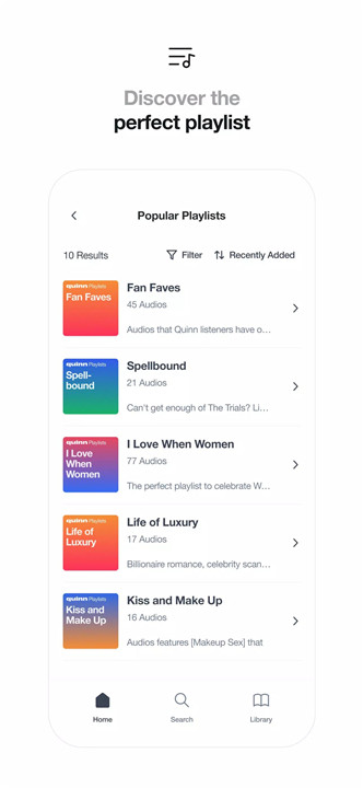 Content on Quinn can be explored through curated playlists, categories, and creators. Playlists such as Trending, Fan Favorites, Sleep Aid, and Healthy Communication guide listeners from quick episodes to longer arcs, helping them discover new favorites effortlessly. The structured library ensures that all content is easy to find and navigate.