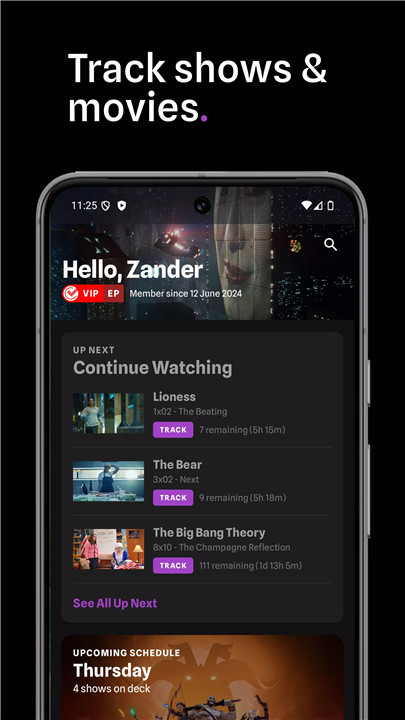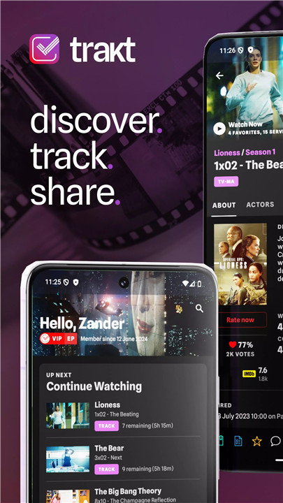 Track detailed progress for every show, including seasons and episodes watched. Instantly see what to watch next and how many times specific episodes have been viewed. VIP members can rewatch shows and automatically recalculate progress for updated statistics.