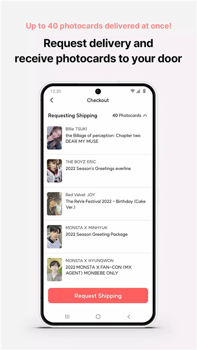Purchased photocards can be securely stored in a personal Collection until shipment is requested. Unlike other services, Pocamarket offers unlimited storage with no additional fees. Users have the flexibility to combine shipments and request delivery whenever convenient.