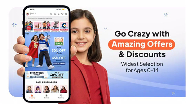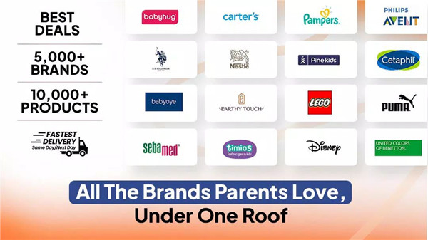 The app offers baby, kids, and maternity products, including clothing, toys, diapers, skincare, footwear, nursery furniture, and baby gear from over 2,000 brands.