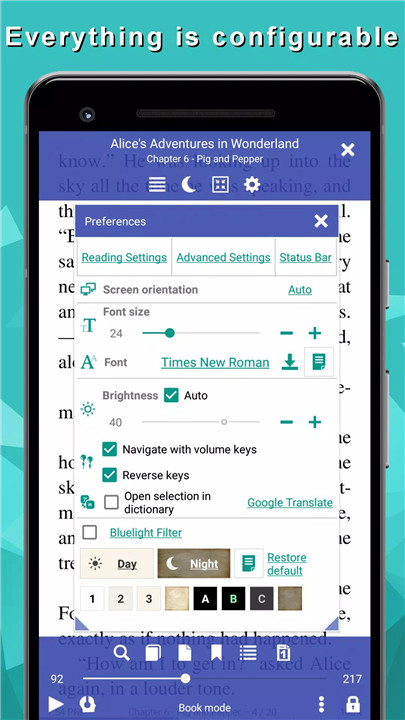 Read aloud any supported format using your device’s TTS engine, or listen to audio files inside the app. Integrated dictionary lookup (GoldenDict, ABBYY Lingvo, ColorDict, etc.) and online translation tools help you understand unfamiliar words instantly—perfect for language learners.