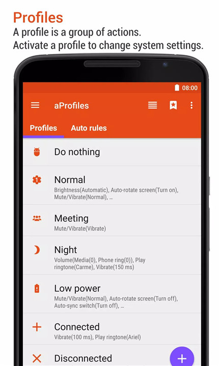 With aProfiles, a profile is a collection of actions that modify your device settings. For example, a “Night” profile can mute your phone, dim the screen, and disable your internet connection simultaneously. You can create as many profiles as you want, name them, assign unique icons, and reorder them easily with drag-and-drop. Profiles can be activated manually or triggered automatically based on your rules.