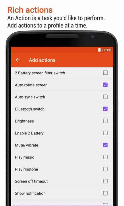 aProfiles supports dozens of device settings, including airplane mode, auto-rotate, Bluetooth, brightness, dark theme, notifications, ringtone volume, wallpaper, and many more. This lets you automate practically anything on your phone. Note that some actions require root access due to Android restrictions.