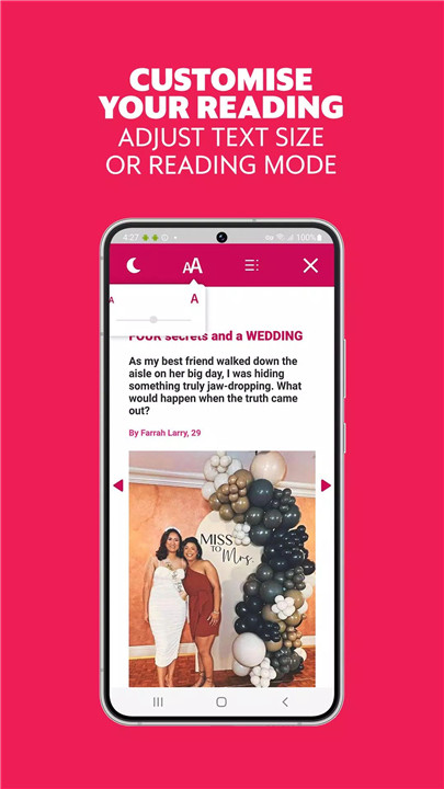 Reading on a mobile device can sometimes be a challenge, especially when the text is too small. With the Take a Break app, adjusting the text size to suit your needs is simple and intuitive. You can easily increase the font size to ensure that every story, whether it’s a real-life drama or health advice, is clear and easy to read.