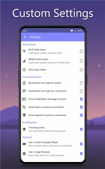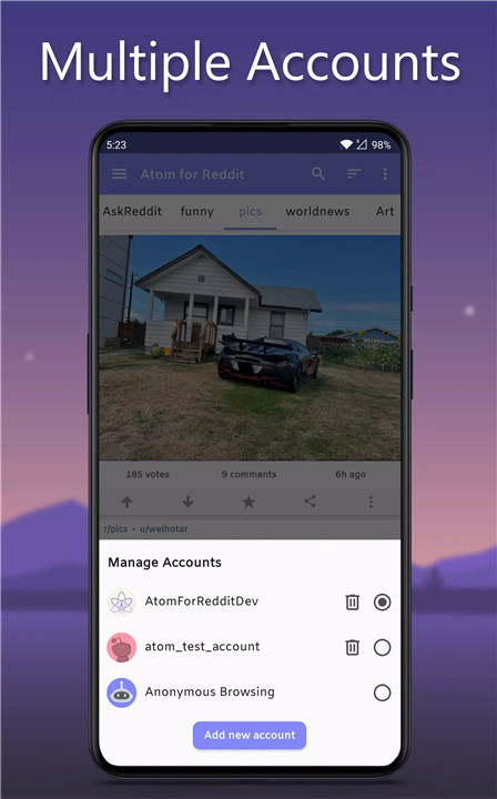 Atom for Reddit includes extensive customization settings to match each user’s preferences. Options include Wi-Fi and mobile data saver modes, video auto-play control, card or list layout views, flair visibility toggles and more. Multiple account support allows fast switching between profiles, while anonymous browsing provides added privacy.