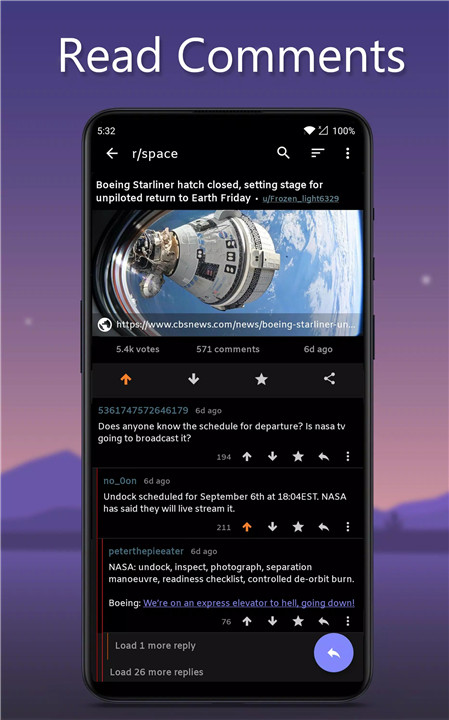 Reading and interacting with comment threads is made effortless through expandable and collapsible comment trees, controlled by simple gestures. Users can upvote, downvote, reply, save, and easily navigate between comments using a custom-designed interface built for clarity and ease of use.