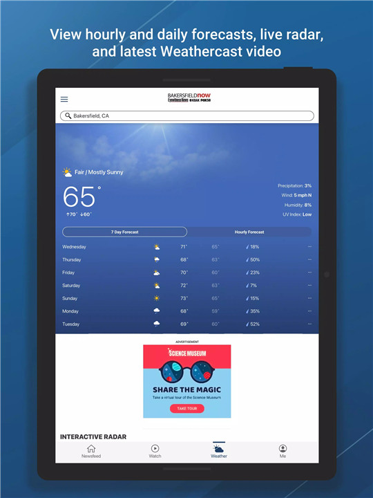 The new weather section delivers precise hourly and daily forecasts tailored to the Bakersfield region and beyond. This upgraded feature helps users plan their day proactively—from temperature changes to severe weather alerts.