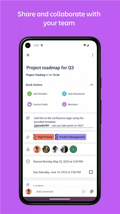 You can assign tasks, leave comments with emoji reactions, share files, and track project progress together in real-time.