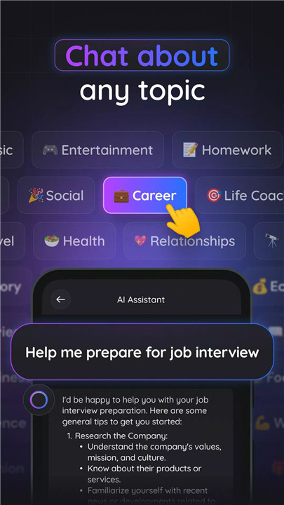 Chat with Gemmy to ask questions, get advice, or simply bounce around ideas. From daily dilemmas to complex concepts, the AI provides thoughtful, accurate responses instantly.