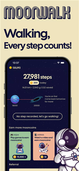 Moonwalk app tracks daily steps and converts physical activity into mooncoins that can later be exchanged for cash.