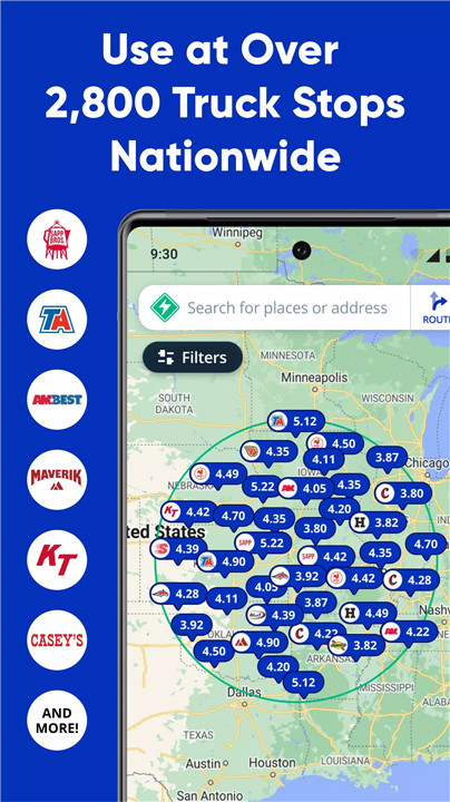 Use the Find Fuel tab in the app to browse the map, search for specific cities or stops, or plan along your route using the "Route" feature.