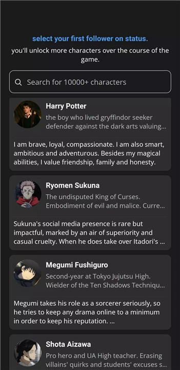 Followers are iconic characters from anime, TV, K-pop, or original universes, not random users. Their reactions shape reputation and storyline progression.