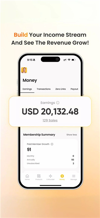 · Home Dashboard: View total members, current month’s earnings, and community activity.