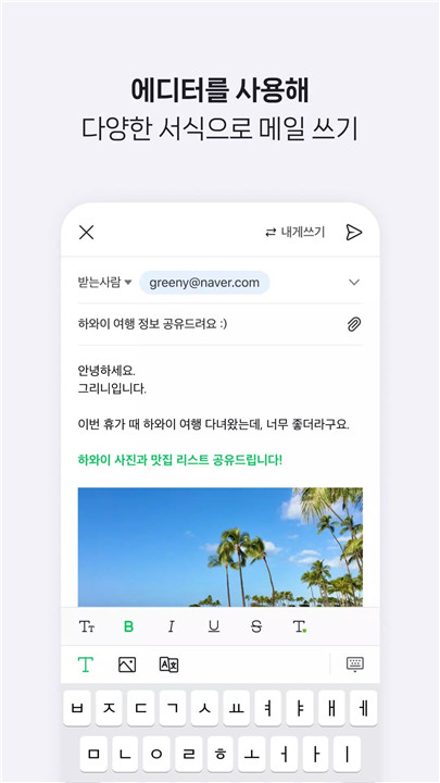 The app offers formatting options, image insertion, MYBOX attachments, and translation capabilities for writing emails efficiently.