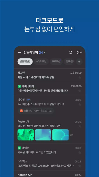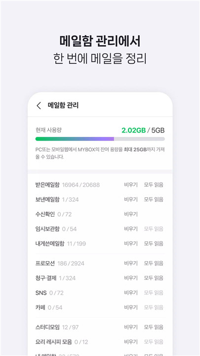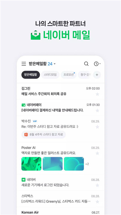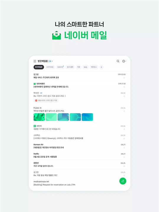 Smart Mailbox: Automatically classifies promotion emails, invoices, payments, social media notifications, and NAVER Café messages for easier navigation.