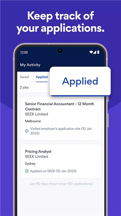 SEEK helps you manage your job search efficiently. Save searches, track applications, and get daily job alerts. With mobile functionality, you can tailor cover letters, update your profile, and apply on the go. Real-time notifications let you know when employers view your application or if you’re likely to progress to the next stage, keeping you informed and proactive.