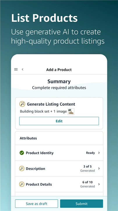 • List Products in a Snap: Quickly create new offers or add fresh products to the Amazon catalog.