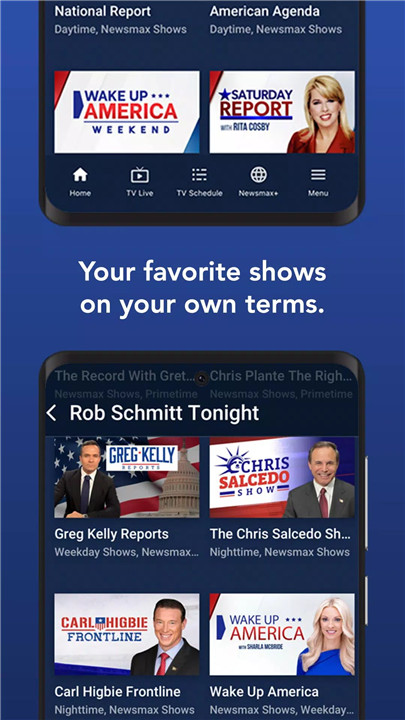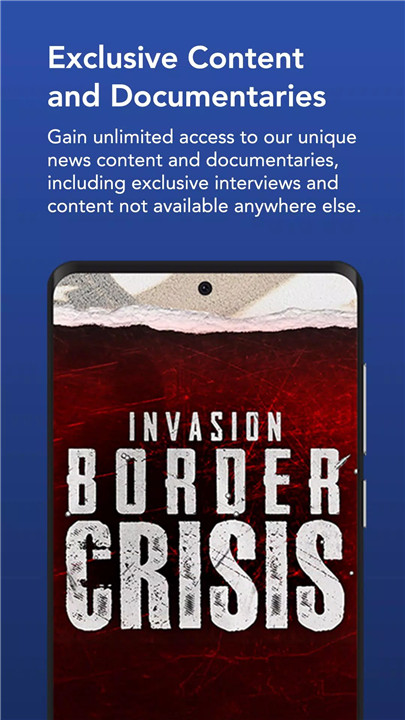 The app provides breaking news, political coverage, finance and health updates, documentaries, and exclusive shows from Newsmax+.