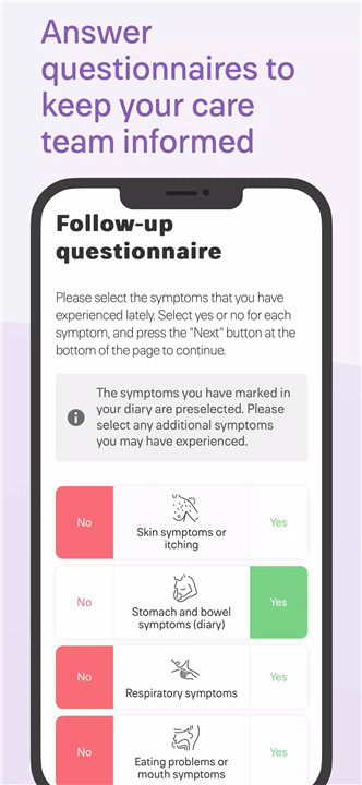 Your healthcare team can send you customized questionnaires related to your treatment or follow-up care. Completing these within the app provides your team with valuable insights that support clinical decision-making and help tailor your treatment plan.