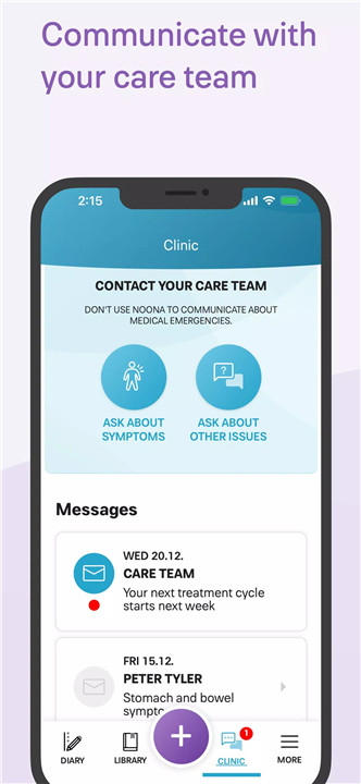 Noona is a secure app designed for oncology and hematology patients to communicate with their care teams, report symptoms, and manage treatment-related information.