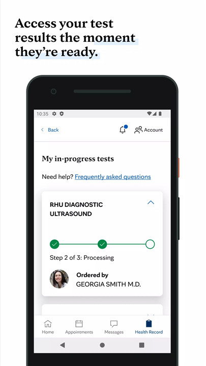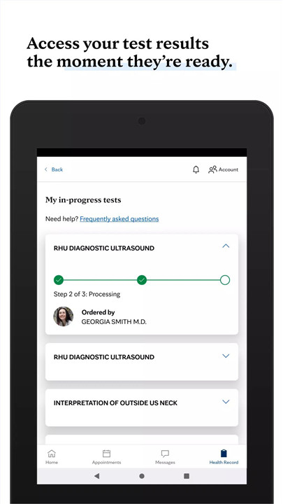 The app enables secure access to health information, including lab results, radiology images, and exam reports. Patients can track their medical history and receive timely updates to make informed decisions about their care.