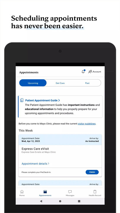 Users can easily schedule appointments with Mayo Clinic specialists and view detailed itineraries. The app provides reminders and allows patients to complete check-in questionnaires before their visits, simplifying the preparation process.