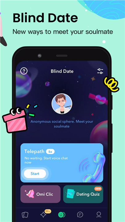 Omi Blind Date: Meet like-minded people in creative ways. Choose an avatar and get started! You can unlock your matches' real pictures after exchanging five messages.