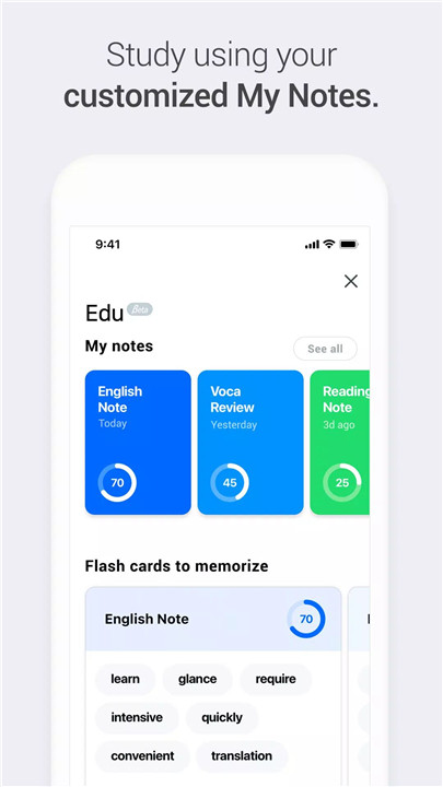 By capturing passages for study, Papago generates a personalized “My Note” for learning vocabulary and phrases efficiently.