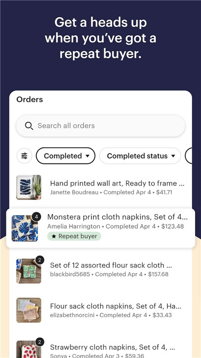 Stay on top of your customer service with real-time messaging. One standout feature? You can view full order details while chatting with buyers—no switching screens or losing context. Plus, repeat buyers are clearly tagged in messages, so you can build better relationships and reward loyal customers.