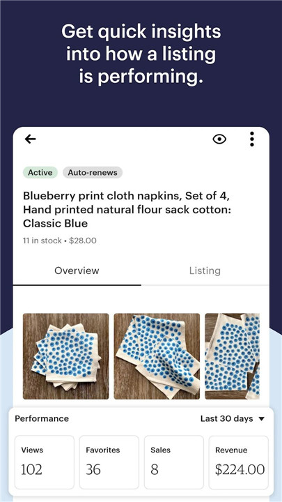 Curious how your shop is performing? The Etsy Seller app provides clear stats including views, sales, and revenue—all in one quick overview. Use these insights to make informed decisions about your inventory, pricing, and promotions.