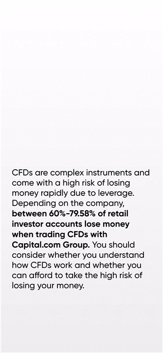 CFDs are complex instruments and carry a high risk of losing money rapidly due to leverage. Between 60%–79.58% of retail investor accounts lose money when trading CFDs with Capital.com Group (depending on the entity). It is important to understand how CFDs work and assess whether the risks are affordable.