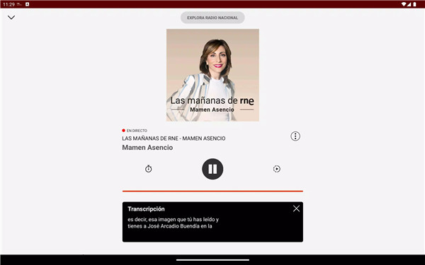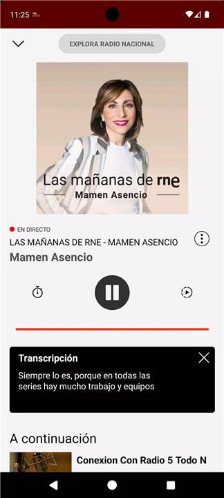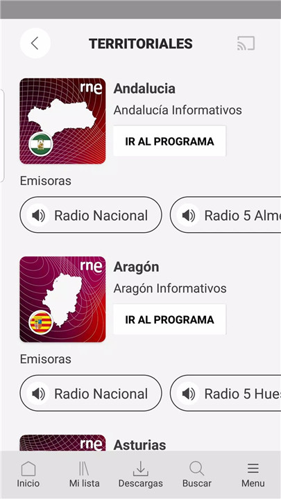 Quick access to all RNE stations is available directly from the app cover. Users can see which presenters are live and tap to start listening immediately. Territorial stations and regional news programs are also available, keeping listeners informed across all areas.