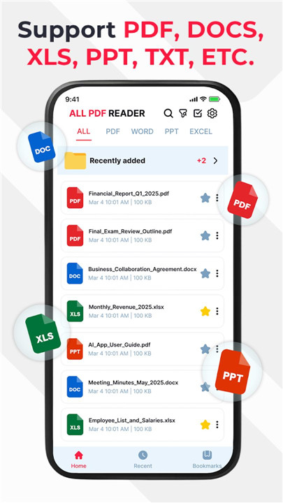 The app supports PDF, DOC, DOCX, XLS, XLSX, PPT, and PPTX file formats.