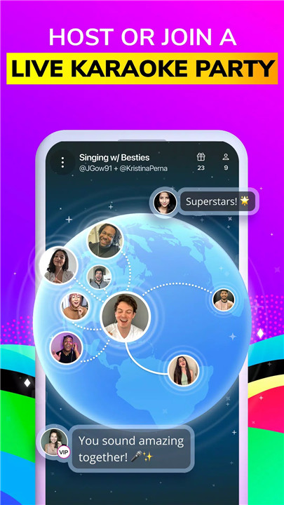 Live Performances: Host or join a live karaoke party using the Sing LIVE feature to give live, audio-only performances 24/7 with friends and music lovers from around the world.