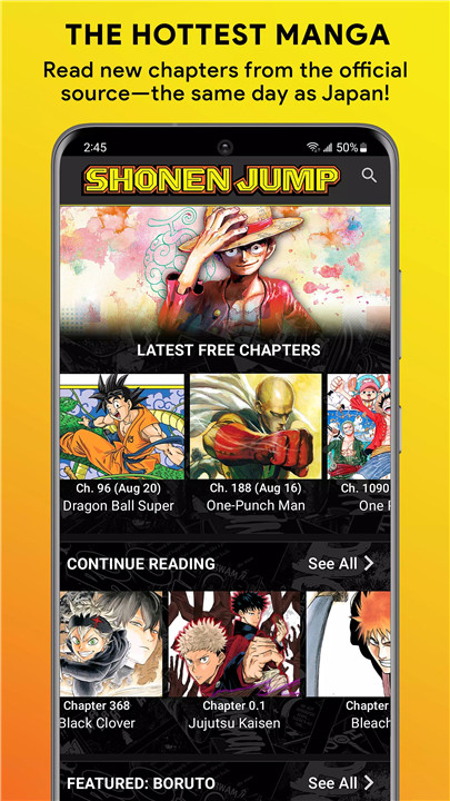 The Shonen Jump app features an advanced manga reader designed for convenience and enjoyment. Stream your favorite manga anytime, anywhere, or download chapters for offline reading. Use landscape mode to appreciate the original two-page spreads as the artists intended. Create an account to sync your progress across devices and pick up right where you left off. Choose between light and dark modes for a comfortable reading experience day or night.