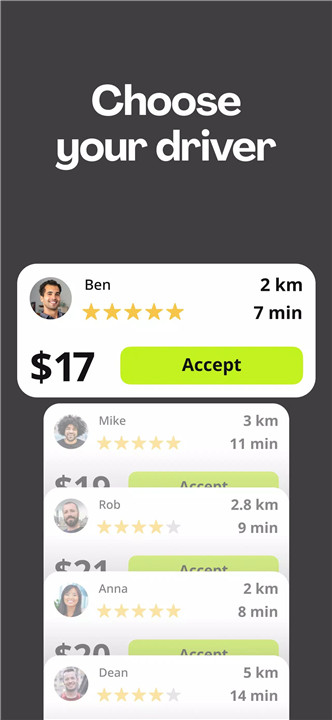 · Choose drivers based on fare offer, car type, arrival time, and ratings.