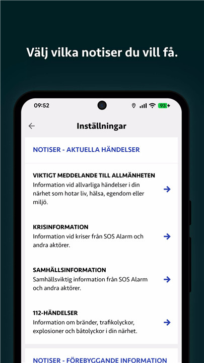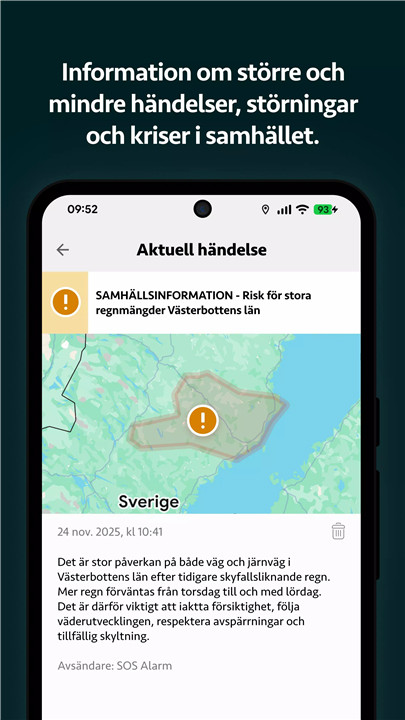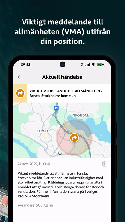 SOS Alarm 112 delivers important public warnings, known as VMA (Viktigt Meddelande till Allmänheten), along with other crisis-related information. Users receive up-to-date guidance issued by authorities, keeping them informed of regional hazards, evacuation notices, or safety instructions.