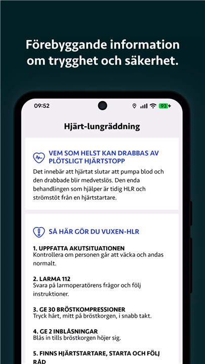 The app includes preventive safety information, such as CPR instructions, first aid tips, and essential phone numbers for emergencies.