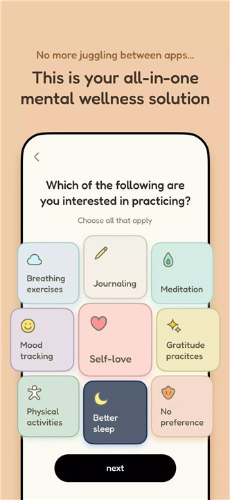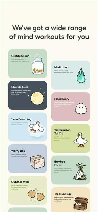 Make mental health management uniquely yours with customizable features like Safe Place, Proud Dandelion, and Treasure Box—uplifting spaces designed to keep you motivated. Track your moods effortlessly with the Mood Tracker, helping you gain insight into your emotional health and maintain balance.