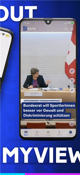 Get real-time news coverage 24 hours a day. The app offers two navigation modes: the standard view for browsing all stories or the personalized "My View" layout, where news is tailored to your favorite topics. Easily switch between categories like Sports, Switzerland, and Business to stay focused on what matters most to you.