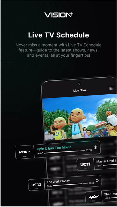 Vision+ is the ultimate streaming platform for anyone who loves entertainment, sports, and original series. From live broadcasts of the Indonesian National Team to exclusive shows starring top Indonesian actors, Vision+ offers a complete entertainment experience. With hundreds of international movies, series, and over 60 premium TV channels, Vision+ makes it easy to watch your favorite content anytime, anywhere.