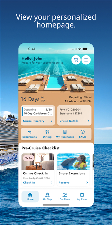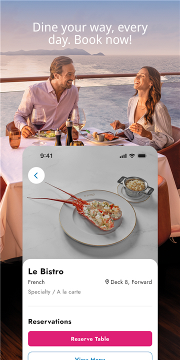 • Connect to the ship's Wi-Fi to navigate the app's features at no additional cost.