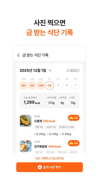 Simply take a photo of a meal, and the app automatically records menu details, calories, and nutritional information. In addition to maintaining dietary awareness, users receive gold for each meal entry. This feature combines healthy lifestyle tracking with reward-based incentives.