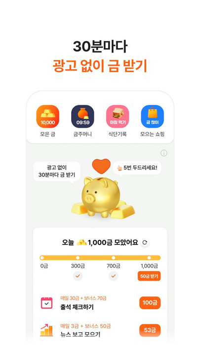 Gold is earned by checking in daily, tapping the gold pig every 30 minutes, recording meals, and using partner store discounts.