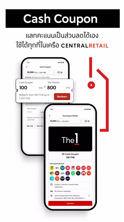 Convert your points to e-cash coupons quickly and easily. Starting from just 800 points, you can redeem a 100 baht coupon to use instantly at Central Retail stores — no waiting for promotions needed.