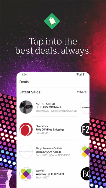 The Deals tab highlights current promotions, trending discounts, and Cash Back offers from popular brands and retailers. With a single tap, shoppers can quickly browse the best available deals across multiple stores.