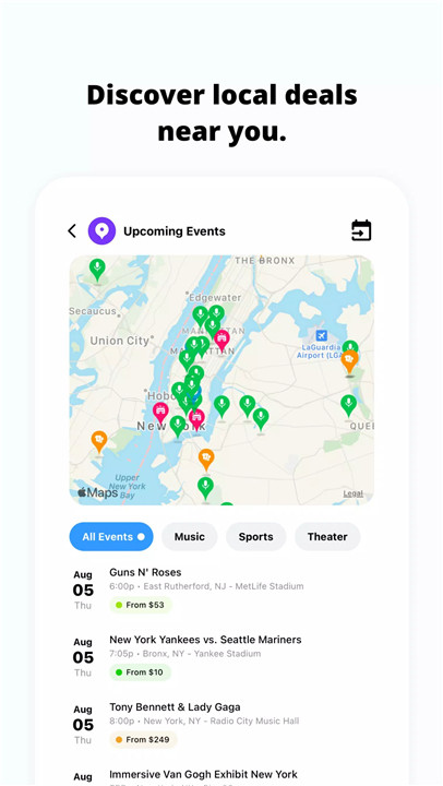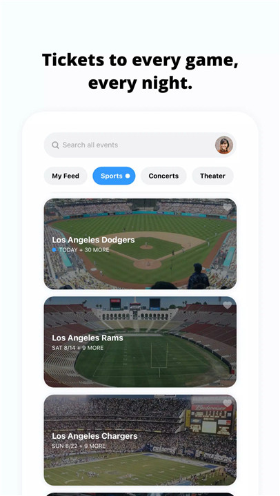 Save your favorite artists and teams by tapping the heart icon. Quickly access all their upcoming events right from the app’s home screen.