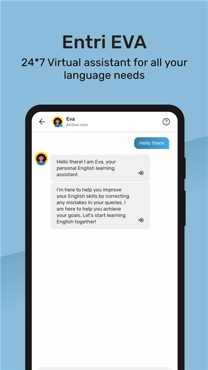 Entri Eva, a virtual assistant for Spoken English, supports learners in improving communication skills through guided practice and interactive assistance.