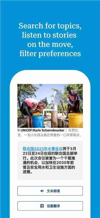 The app delivers news through various formats, including written articles, videos, podcasts, photo features, and audio programs. Users can watch or listen to informative content anywhere, making it easy to stay connected with UN developments.