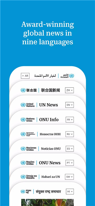 The app provides content in Arabic, Chinese, English, French, Russian, Spanish, Kiswahili, Portuguese, and Hindi.